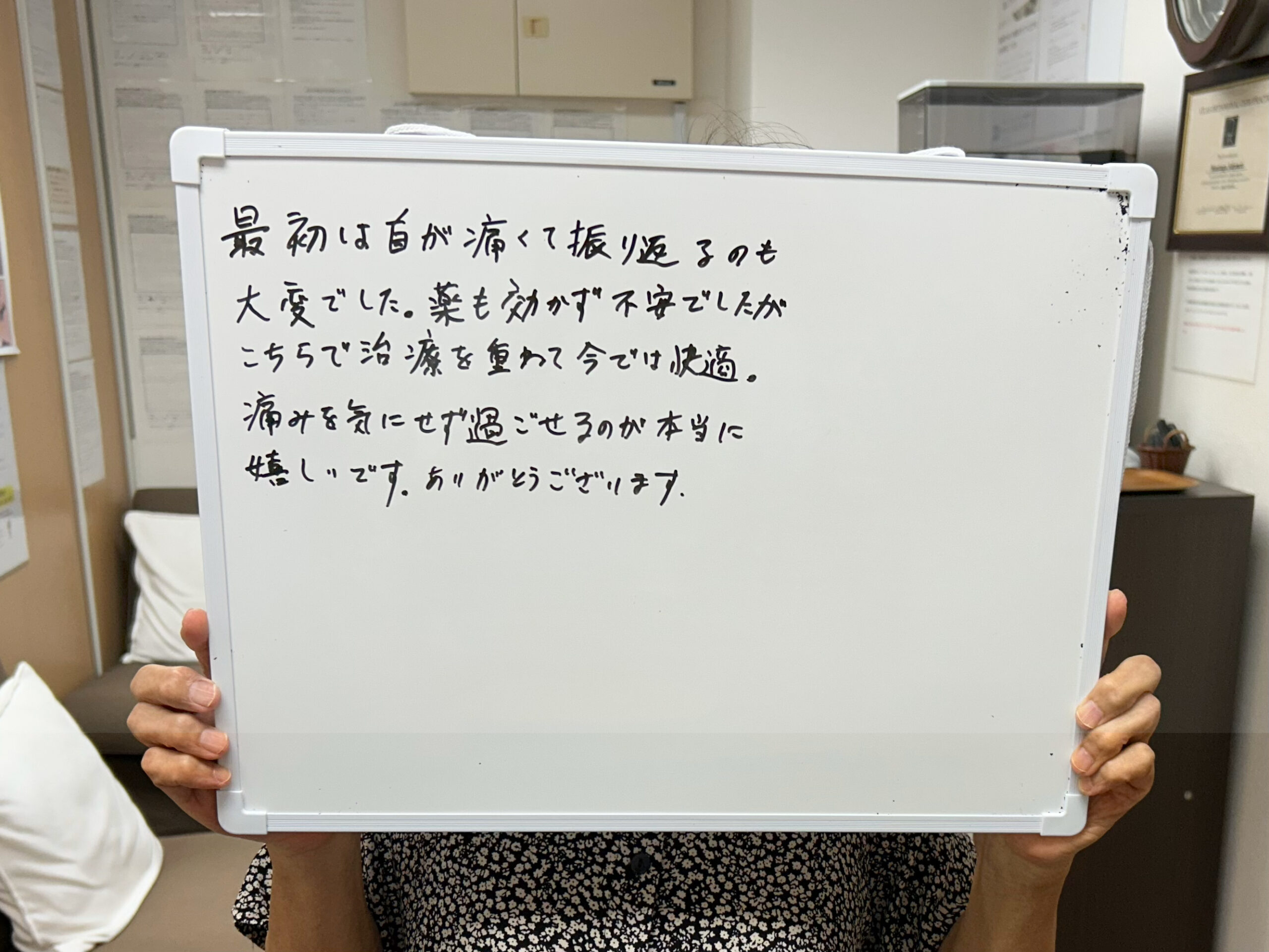 「最初は何年間も悩み続けた痛みがこんなに変わるとは思いませんでした。信号待ちの時、首を痛めるのが怖くて身体ごと動かしていたのに、今では首だけで自然に動かせます。自分でもびっくりしています」
