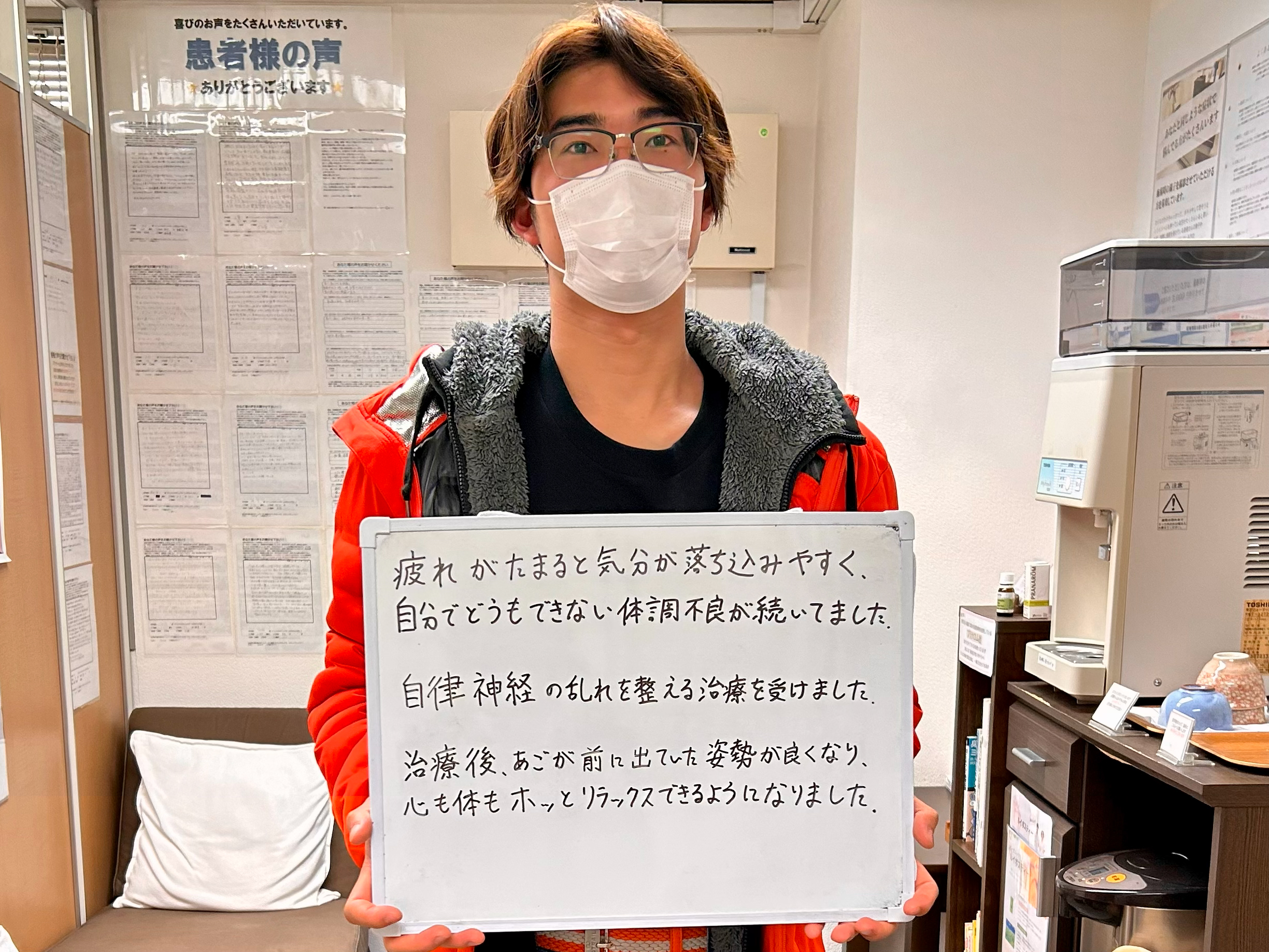 今回は「寒さ」という外部のストレスに加え、無意識に顎が上がって首の付け根(自律神経のスイッチがある場所)を圧迫していたことが、気分の落ち込みや体調不良に大きく影響していましたね。