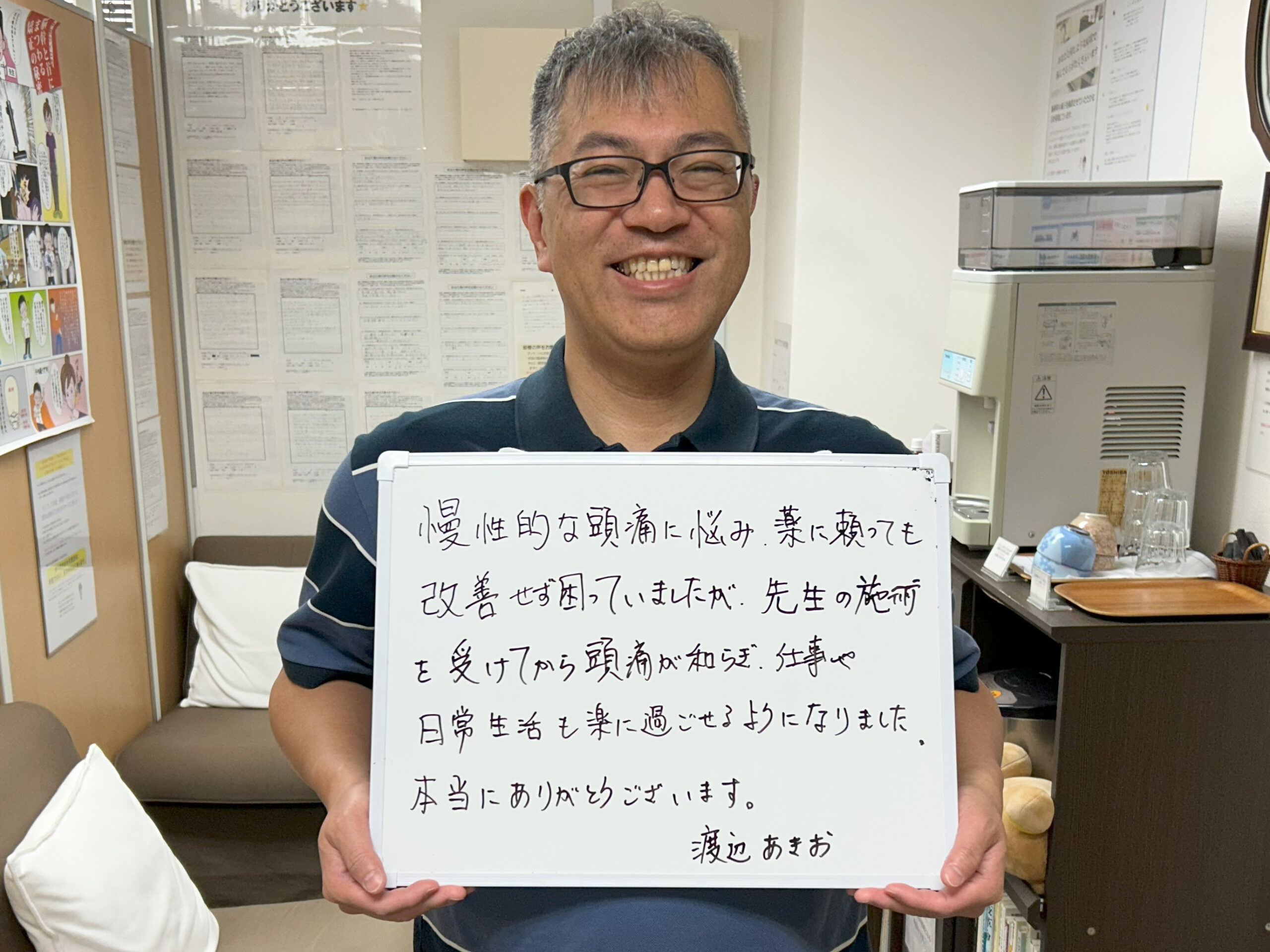 – 主訴は「こめかみや後頭部の締め付け感」「首を動かすと痛い」。